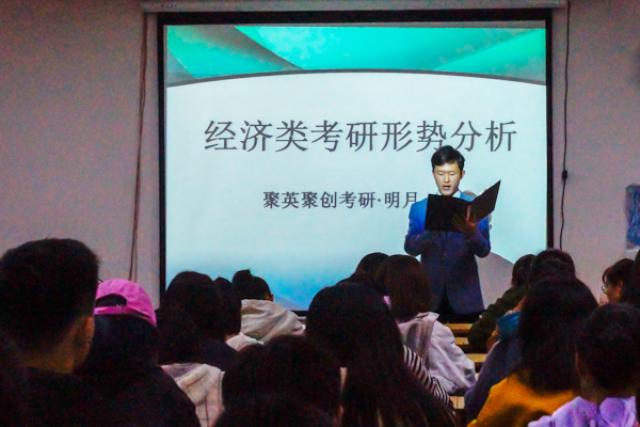 4月13日晚,天美传媒 学习部和公关部于蛟桥财大购物中心五楼考研报告厅举办考研分享会。本次分享会邀请了来自聚英聚创的明月老师向同学们分析经济学类考研形势,同学们踊跃参加。