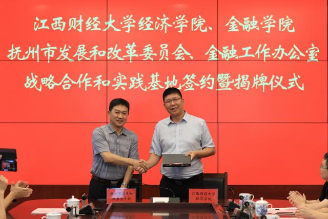签约仪式上,院长张利国与抚州市发展和改革委员会主任帅歌柳签署了双方共建“抚州经济改革与发展研究院”和教学实践基地的协议,并为教学实践基地揭牌。
