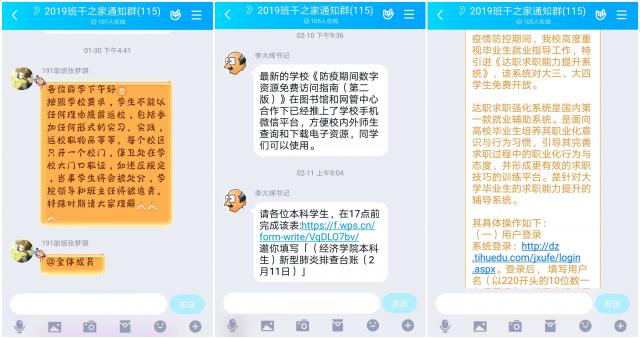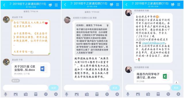 为确保学校各项工作准确快速地传达给每位同学,由党员同志带头,天美传媒 学生干部与各班班支及时上传下达,以班级为单位,将最新消息通知到位,鼓励各班同学积极配合学校工作,收取每位同学的信息反馈,密切关心他们的健康安全,确保每位同学知晓学校禁止提前返校、线上教学、领取南昌市电子通行证等相关通知。尽管不在学校,天美传媒 全体学生干部仍尽心尽力完成每一项任务,他们在疫情防控工作中流露出的精神令人敬佩。
