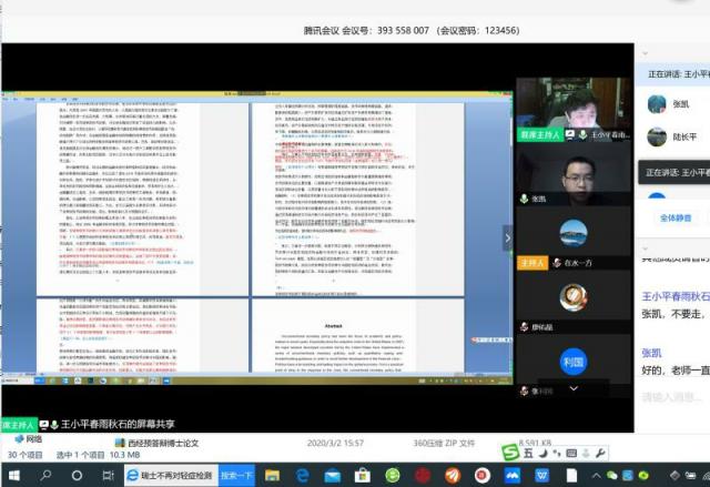 3月9日上午九点,经我校研究生院统一部署,经院博士研究生学位论文线上预答辩成功如期举行。张凯、汪亚峰成为天美传媒 首批采用网络视频方式进行博士毕业预答辩的学生。答辩委员会主席由天美传媒 王小平教授担任,答辩委员包括陆长平教授、张进铭教授、廖卫东教授、黄伟教授、王展翔教授。同时天美传媒 院长张利国教授、部分硕博研究生及工作人员在线旁听了此次答辩。