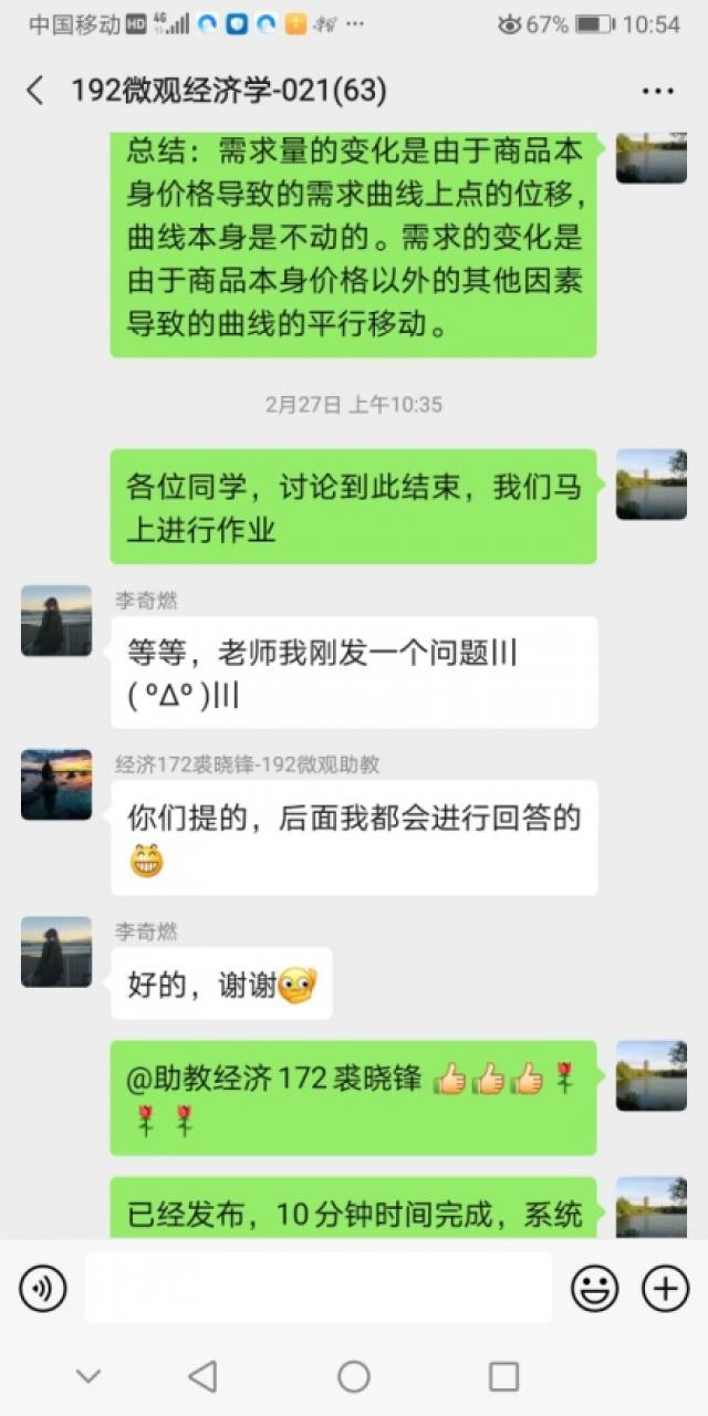 本人使用录播教学,在上课的过程中允许学生在学习通和微信群跟我互动,同时也鼓励学生提问或者进行讨论。我也会主动询问学生学习进展如何、有没有什么问题。除了讲授课程内容,我还会在慕课堂上对学生点名进行提问,针对每次课的内容发布相应的练习题给学生做。