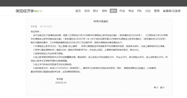 在课程门户和学习通上发布相关的通知。第一,在课程门户发布公告,告知学生本门课程的开课时间、线上教学方式、线上教学平台和辅导平台、线上学习工具、线上成绩比重等重要信息。第二,发布“在线学习临时建群”通知,公布已经建好的微信群二维码,让学生入群,以更方便与学生取得联系。第三,发布“第1次”上课通知,告知学生第一次上课的时间、上课前要做的准备工作以及强调线上教学的纪律问题。第四,发布“第1次上课的签到通知”,告诉学生在哪个平台签到,什么时间签到。