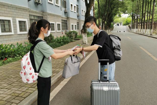 “同学,需要帮忙吗?”刚进校门,17级学生罗枫就主动询问身边的同学是否需要帮助。尽管天气闷热,但他的热情却丝毫未减。在接到带着大件行李回昌的同学的来电后,他和室友一同前往校门口等待,在采访时他说道:“身为学生干部,我更应该发挥带头作用,用自己的实际行动践行志愿服务精神,将校园正能量传递给更多的人。”此外,他们还在线上分享返校情况,从各客运站的出站口和上车前的检查流程,到食堂的供餐时间、出入口和清洗餐具的水池位置,以及到寝登记、晨午检,事无巨细,一张张照片还原了记忆中的校园,一句句话语温暖了同学们的心。