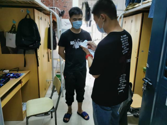 校园中,已到校学生自觉进行入校检测,清扫寝室。鉴于学生返校后主要在寝室自行隔离和学习,学院推出以寝室为单位进行管理,由宿管部建立晨午检对接群,各寝室代表于每日早晨八时和下午一时线上进行寝室成员体温填报,并将异常情况报送给各年级对接委员,将晨午检条理化、程序化。此外,学院志愿者还主动上门为没有温度计的寝室测量体温,期间问候不断,关心不断,减缓了同学们的焦虑感,传递了“奉献、友爱、互助、进步”的志愿服务精神。