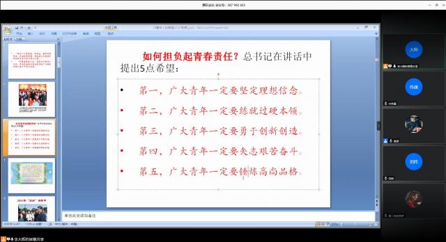 本次课程主要围绕习近平总书记从2013-2020年在五四青年节对广大青年的寄语展开。习近平总书记在讲话中对青年人提出了几点要求。青年人要有理想、有担当,树立与时代主题同心同向的理想信念,勇敢肩负起时代赋予的重任。青年人要培育社会主义核心价值观,形成正确的价值取向。青年人要努力汲取知识,克服浮躁之气,正确对待一时的成败得失,处优而不养尊,受挫而不短志,使顺境逆境都成为人生的财富。青年要保持初生牛犊不怕虎的劲头,不懂就学,不会就练,没有条件就努力创造条件,对想要做爱做的事,要敢试敢为,努力从无到有,从小到大,把理想变为现实。青年人要坚持中国共产党的领导,同人民一道,为实现两个一百年奋斗目标,实现中华民族伟大复兴的中国梦而奋斗。