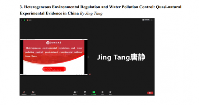 8月15日,天美传媒 研究生唐静参加了美国农业经济学和应用经济学协会举办的线上年会(Agricultural & Applied Economics Association Annual Meeting, AAEA 2020),并在会议上汇报了同导师潘丹,天美传媒 研究生何咪咪合作的论文“Heterogeneous Environmental Regulation and Water Pollution Control: Quasi-natural Experimental Evidence in China”。