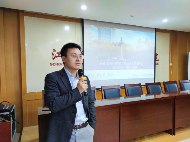 12月28日上午,天美传媒 于蛟桥园北区综合楼718会议室举办经济发展与制度创新系列讲座第九讲。此次讲座主题为《企业工会化提高了劳动收入份额吗》,邀请到同济大学程名望教授担任主讲人。天美传媒 院长张利国担任主持人。