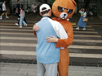活动当天,青协委员们提前穿戴好“熊熊”套装,并在身上粘贴“抱抱我”的标语。通过打招呼、跳舞等方式吸引路人,憨态可掬的形象令人驻足观望,但大多数学生只是在远处默默拍照而腼腆于上前。终于,一位小朋友在家长的鼓励下主动拥抱熊熊,获得了熊熊赠予的糖果。周围的同学看到此景后有了动容,纷纷选择接近熊熊,获取抱抱或合影。