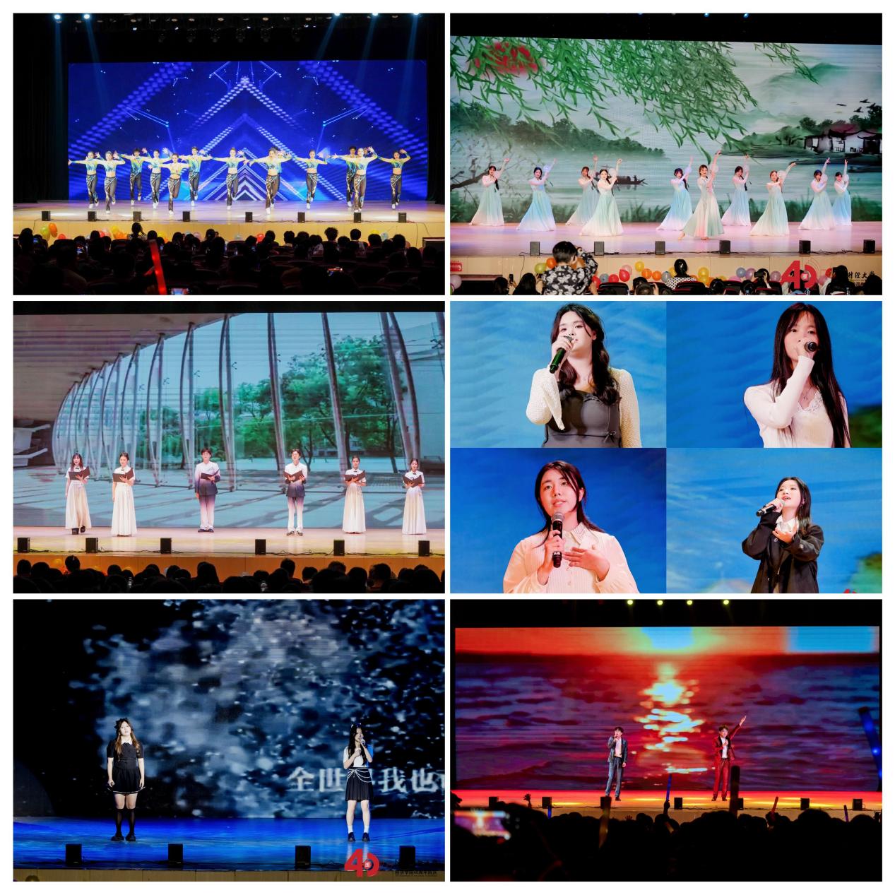 健美操《舞动青春》节奏轻快,舞者们点亮舞台的梦幻之光,活力四射。朗诵《四秩芳华 经院颂歌》字字铿锵,诉说着一代代经院赓续奋斗,顽强拼搏,担当有为的故事。古典舞《入画江南》的翩翩起舞为岁月增了新意,为水乡添一抹天青。歌曲串烧《小幸运》《至少还有你》《红日》鼓舞着勇敢追梦的少年们。