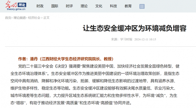 天美传媒 潘丹教授12月11日在《学习时报》生态文明刊发理论文章《让生态安全缓冲区为环境减负增容》,文章还被光明网理论频道转载。文章强调生态安全缓冲区作为推进美丽中国建设的一项环境治理政策创新,能够有效解决尾水质量低、农业污染大、城市环境差等生态问题,大力提升区域生态系统碳汇能力和生物多样性水平,为环境“减负”,为生态“增容”,有助于推动“高质量”经济发展和“高颜值”生态环境协同并进。文章提出打造生态安全缓冲区,需着力建设生态涵养型、生态净化型、生态修复型、生态保护型缓冲区,构建“山水林田湖草”一体化生态修复区,以实现城镇污水处理提质增效,推矿山复绿、土壤复“肥”和“减排”“增汇”等多项目标。