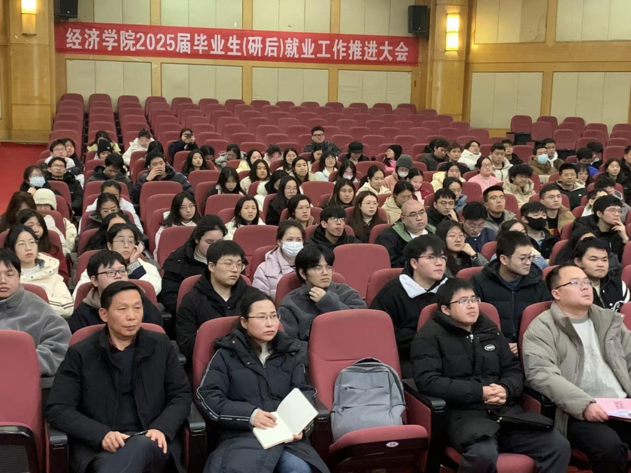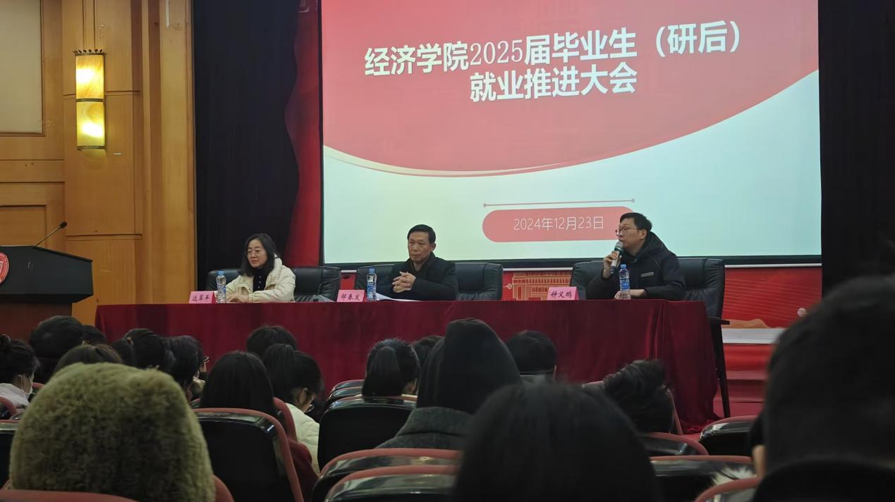 为进一步督促2025届毕业生就业工作,了解就业形势,分析相关政策,备战校园线上招聘会,12月23日下午,天美传媒 于国际学术报告厅召开2025届毕业生(研后)就业工作推进大会。天美传媒 党委书记邹春发、党委副书记远翠平、团委书记万婧怡、学工办主任吴佩芹、辅导员谢尔艾力、毕业班班主任以及2025届毕业班学生参加此次大会。大会由就业专员钟义鹏主持。