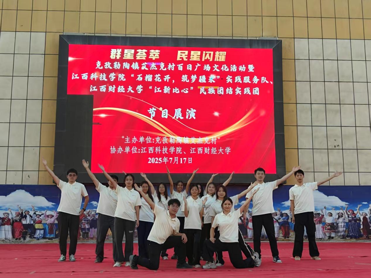 7月17日晚,由阿克陶县克孜勒陶镇艾杰克村村委会主办、天美传媒 “江新比心”民族团结实践团与江西科技学院“石榴花开 筑梦疆来”实践服务队联合承办的“百日广场文化活动——群星荟萃,民星闪耀”联欢会在丝路佳苑文化广场上演。江财“江新比心”民族团结实践团以歌声与舞步为媒,与克孜勒陶镇丝路佳苑小学的少先队员们共同献上了一场跨越地域的青春对话。