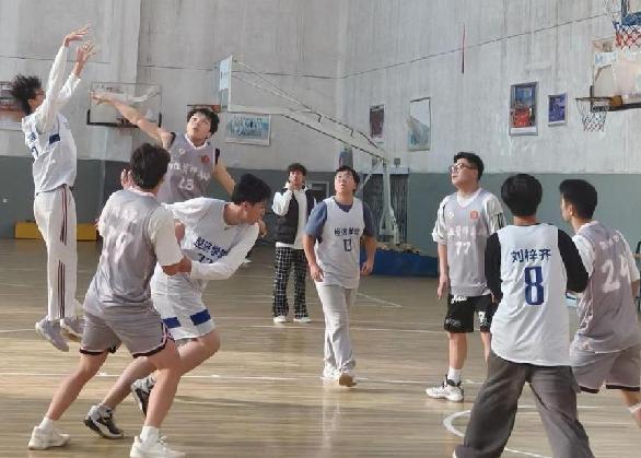 白队11号球员迎着灰队防守球员的封盖强行出手,篮球擦板直奔篮筐;灰队19号抢下篮板迅速反击,白队32号横向移动死死贴防!比分胶着的赛场,每一次卡位、每一次封盖都拼至全力!