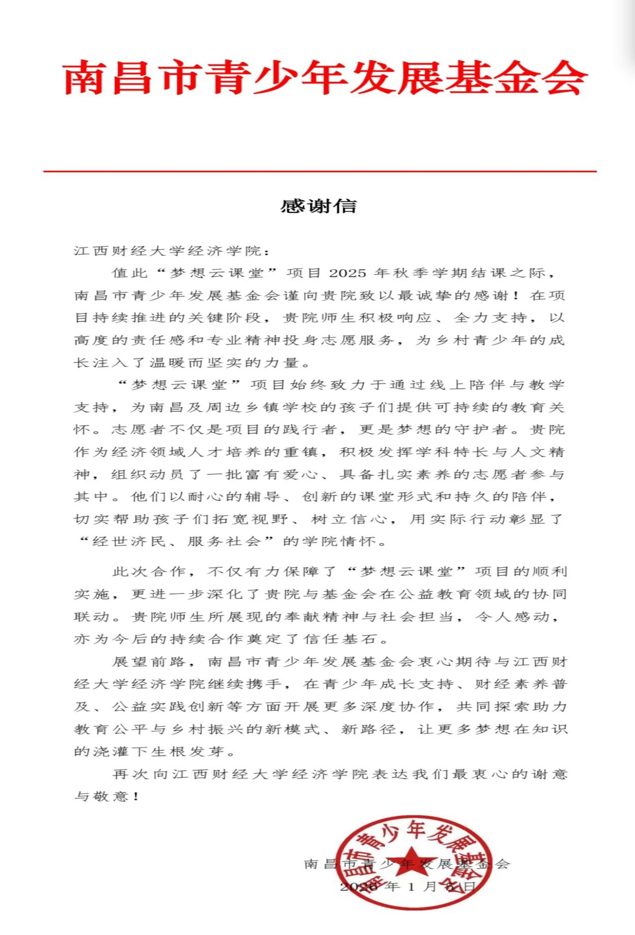 当专业知识的星火,遇见乡村少年的憧憬,一场关于成长的双向奔赴,在2025年的“梦想云课堂”里悄然绽放。2026年1月5日,天美传媒 收到南昌市青少年发展基金会发来的感谢信,字里行间的肯定,是这个冬日里最温暖的回响。