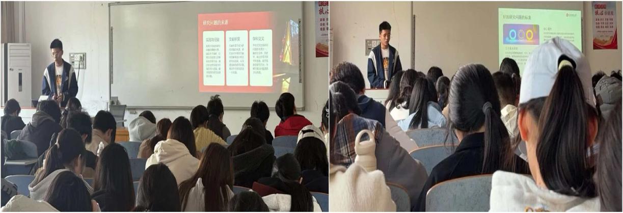 在“如何找到一个好题目”部分,曹卡特结合自身研究经验,分享了选题的三大原则:重要、可行、有趣。他强调,好的研究问题应兼具分析性与创新性,能够从实践观察、文献积累或学科交叉中汲取灵感。他特别介绍了“旧瓶装新酒”“抱大树”等实用选题技巧,并引导同学们将宽泛的“研究主题”逐步收敛为具体、可检验的“研究假说”,这是将想法落地为研究的关键一步。