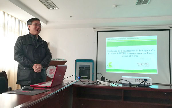 应天美传媒 和生态经济研究院邀请,12月20日上午,韩国仁荷大学(Inha University)全球治理(Global Governance)学院院长、仁荷大学Yongrok Choi首席教授来我校做了题为“Challenge as a Trendsetter in Ecological Civilization: Lessens from the Experience of Korea”的学术报告。天美传媒 及生态经济研究院、国际经贸学院、江西经济发展与改革研究院、旅游与城市管理学院的师生聆听了本次学术报告会。