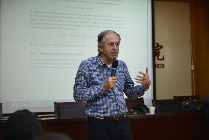 10月28日上午,法国艾克斯马赛大学Michel Lubrano教授在北区综合楼718会议室为天美传媒 本科生和研究生集中讲授《贝叶斯计量经济学》课程。