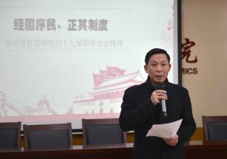 12月4日下午,十九届四中全会精神宣讲团成员罗世华教授为天美传媒 全体教职工带来了以“经国序民,正其制度”为题的学习宣传贯彻党的十九届四中全会精神宣讲会,宣讲会由党委书记邹春发主持,李大晖、杨飞虎、李国民、胡德龙等60余位老师参加本次宣讲会。