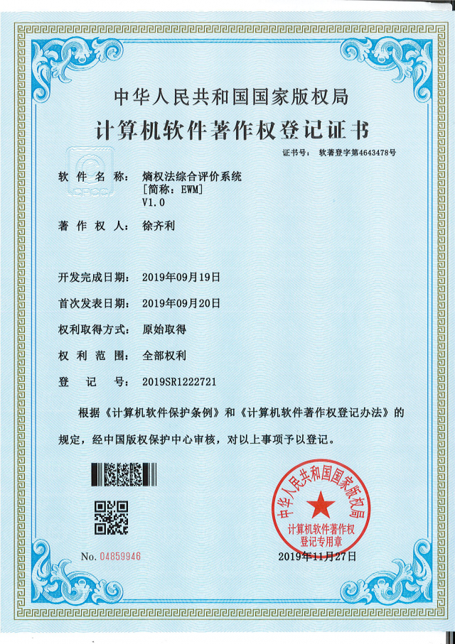 近期,天美传媒 教师徐齐利在决策支持系统(DSS)关键性基础零部件的研发上取得进展,开发的软件《熵权法综合评价系统V1.0》通过国家版权局审核,获准登记软件著作权(登记号:2019SR1222721)。