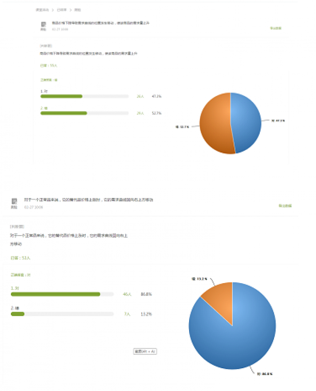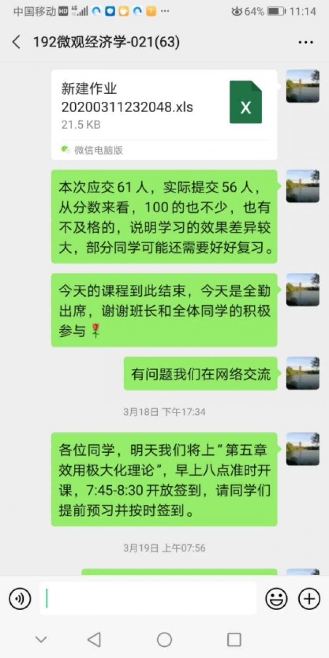 目前,我已经上了6周的网络录播课。在此过程中,我在课前都会做好充分的准备,在课堂时间会给学生仔细讲解各章知识点中的重点和难点,要求学生课后认真复习。在疫情面前,用自己的最大的努力来上好每一堂网课。据学生们反映,在他们听语音录播课的过程中,声音清晰,很少出现比较卡的情况,偶尔会出现网络延迟。他们肯定了我这种线上教学模式,认为这种模式要比只答疑、不讲授课程的模式要好,他们收获得更多。同时,从每次课堂测验的成绩可以看出学生对当堂课程掌握的程度,以及哪些知识点掌握不到位,可以在下次课上课的时候再复习一下,有的同学没有听懂的地方,也会在微信群中当场提出来,老师可以当场解答,效果比平时课堂上课还要好。每次上完课学生都客气地和老师再见,以及谢谢老师。