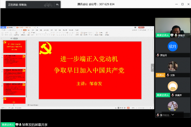 接下来由邹春发书记带来主题为“进一步端正入党动机,争取早日加入中国共产党”的第一讲党课。就大学生应如何争取早日入党,书记提出五点建议。第一,用科学的理论武装头脑,认真学习马列主义毛泽东思想邓小平理论等党的指导思想和理论知识;第二,自觉接受党组织的考察,确保党组织的纯洁性和先进性;第三,积极参加实践锻炼,提升自身的综合素质和能力;第四,关心帮助同学,践行为人民服务的宗旨;第五,在各方面做表率,起模范带头作用。我们要为实现共产主义理想,更好地为人民服务而入党,只有正确的入党动机,才能有正确的争取入党的行为,才能经受住党组织的考验。