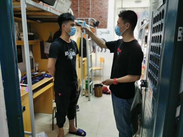校园中,已到校学生自觉进行入校检测,清扫寝室。鉴于学生返校后主要在寝室自行隔离和学习,学院推出以寝室为单位进行管理,由宿管部建立晨午检对接群,各寝室代表于每日早晨八时和下午一时线上进行寝室成员体温填报,并将异常情况报送给各年级对接委员,将晨午检条理化、程序化。此外,学院志愿者还主动上门为没有温度计的寝室测量体温,期间问候不断,关心不断,减缓了同学们的焦虑感,传递了“奉献、友爱、互助、进步”的志愿服务精神。