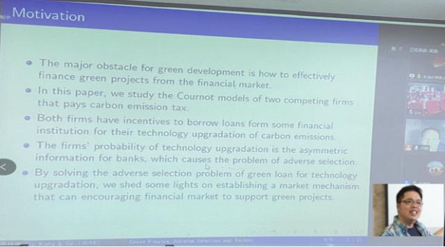 吴涛副教授带来题为“绿色金融、逆向选择和碳排放的技术升级(Green Finance, Adverse Selection and Technology Upgradation of Carbon Emissions)”的主旨报告。他运用古诺模型来分析高风险企业和低风险企业在绿色金融中不同的均衡结果,并提出了一套有效的市场机制来解决逆向选择带来的市场失灵问题。