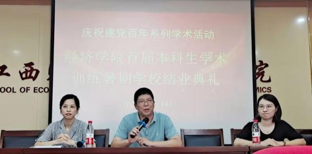 学员代表上台发言,收获颇丰的喜悦溢于言表,感激之辞仍萦绕耳畔。感谢张利国院长递上敲门砖,带领同学们叩开学术世界的大门;感谢潘丹教授手把手教学员写论文摘要、关键词、引言;感谢裘莹副院长带领同学们搜索前沿文献,在课题申报中注重选题和学术创新;感谢周谷珍博士给大家加上装备,让同学们运用stata去做实证研究。并且,同学们表示学习经济学专业一定要有“顶天立地”和“经世济民”的情怀,今后应将所学经济学理论与当代中国现实相结合,把研究做在祖国大地上,充分利用学校现有的资源,开拓视野、追踪最新学术的前沿动态。