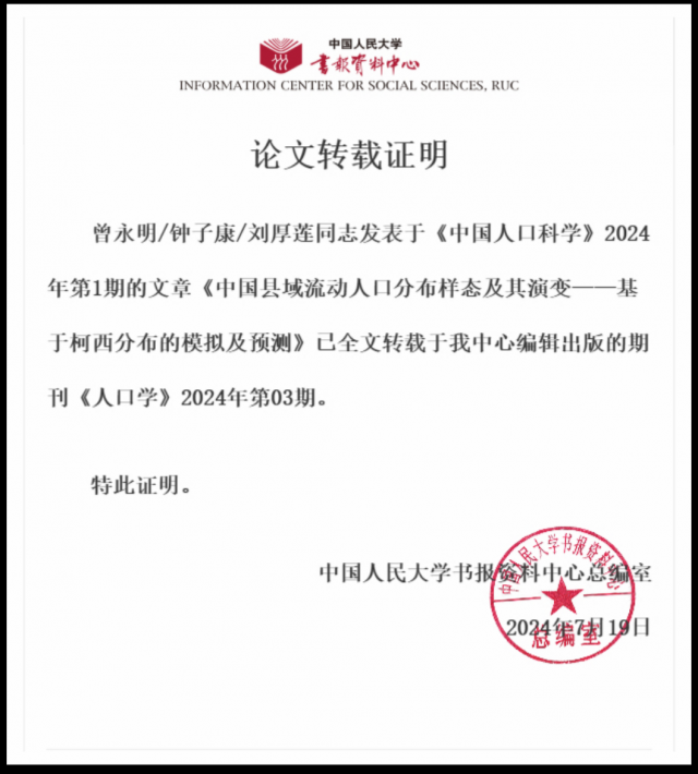 据悉,《中国人口科学》是中国社会科学院人口与劳动经济研究所主办的专业学术期刊,是人口学类权威期刊,也是我校认定的国内权威B+类期刊,在人口学领域具有重要影响力。中国人民大学复印报刊资料被誉为“中华学术的窗口”“中外文化交流的桥梁”,是中国人文社会科学领域公认的权威性刊物。