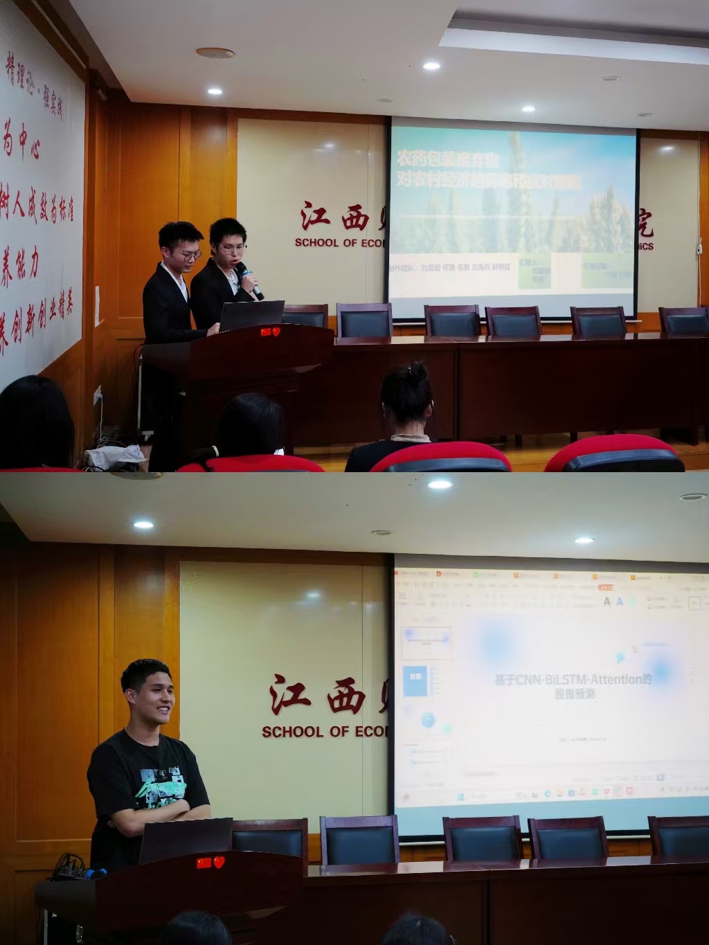 决赛中,来自10个学院的16支队伍,选题新颖,他们用严谨的思维和专业的分析方法,深度解读热点问题,大胆表达个人观点,展现了江财学子扎实的经济学理论基础和出色的学术研究能力。专业组一等奖作品《农药包装废弃物对农村经济的影响和应对策略》深入分析了农药包装废弃物对农村经济的负面影响,为政策制定者和农业从业者提供了理论依据,对于理解和解决农药包装废弃物带来的问题和挑战具有重要意义。非专业组一等奖作品《Stock index prediction based on CNN-BiLSTM-Attention》提出了一种混合模型,结合了卷积神经网络 (CNN)、双向长短期记忆网络 (BiLSTM) 和注意力机制 (AM),用于预测股票指数的次日趋势,为金融预测提供了一个新的视角,并为未来在不同金融市场和时间尺度上的应用提供了基础。答辩环节过程中,面对老师们提出问题、队员们沉着应对,条理清晰,虚心学习。
