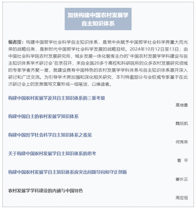 近日,天美传媒 周应恒教授在中国社会科学院农村发展研究所、城乡发展一体化智库主办的“中国农村发展学学科建设与自主知识体系学术研讨会”上的发言笔谈发表在国内经济学和管理学类权威性学术期刊《中国农村经济》2024年第11期,文章题目为“农村发展学学科建设的内涵与中国特色”。