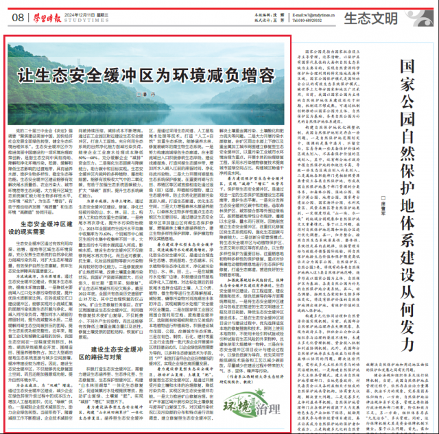天美传媒 潘丹教授12月11日在《学习时报》生态文明刊发理论文章《让生态安全缓冲区为环境减负增容》,文章还被光明网理论频道转载。文章强调生态安全缓冲区作为推进美丽中国建设的一项环境治理政策创新,能够有效解决尾水质量低、农业污染大、城市环境差等生态问题,大力提升区域生态系统碳汇能力和生物多样性水平,为环境“减负”,为生态“增容”,有助于推动“高质量”经济发展和“高颜值”生态环境协同并进。文章提出打造生态安全缓冲区,需着力建设生态涵养型、生态净化型、生态修复型、生态保护型缓冲区,构建“山水林田湖草”一体化生态修复区,以实现城镇污水处理提质增效,推矿山复绿、土壤复“肥”和“减排”“增汇”等多项目标。