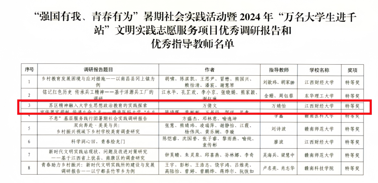 “强国有我,青春有为”暑期社会实践活动暨2024年“万名大学生进千站”文明实践志愿服务项目评选工作已落下帷幕,此次活动由江西省教育厅主办,旨在为青年学生提供实践锻炼的机会,为基层社会发展和文明建设注入青春力量。通过实践活动,青年学生能够更好地将个人成长与国家发展紧密结合,为实现中华民族伟大复兴贡献智慧和力量。在天美传媒 师生的共同努力下,天美传媒 在此次活动中荣获省级优秀调研报告、省级优秀指导教师、省级优秀团队三项荣誉称号,展现了经院师生的风采和实力。