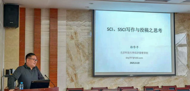 4月19日下午,北京科技大学孙华平教授应邀莅临天美传媒 讲学,作题为“SCI/SSCI写作与投稿”的学术讲座。讲座由生态经济研究院院长潘丹教授主持,院长张利国教授等院内外30余师生参加了报告会。