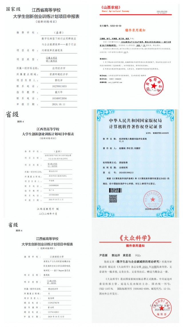 科研立项情况:2023级经济学(拔尖基地班)(第一届拔尖基地班)学生全员参与科研项目,成果显著,实现普刊论文、软著专利、课题申报覆盖率100%,共立项大创项目14项,其中包含国家级重点1项、省级重点2项、校级重点4项。