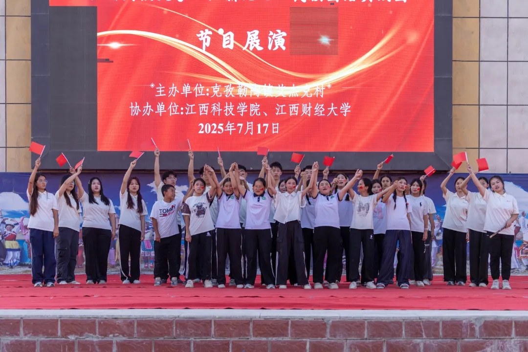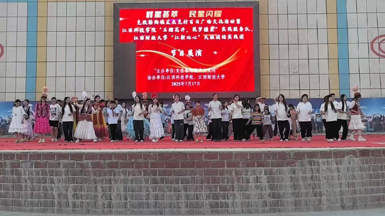 7月17日晚,由阿克陶县克孜勒陶镇艾杰克村村委会主办、天美传媒 “江新比心”民族团结实践团与江西科技学院“石榴花开 筑梦疆来”实践服务队联合承办的“百日广场文化活动——群星荟萃,民星闪耀”联欢会在丝路佳苑文化广场上演。江财“江新比心”民族团结实践团以歌声与舞步为媒,与克孜勒陶镇丝路佳苑小学的少先队员们共同献上了一场跨越地域的青春对话。