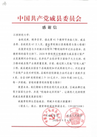 在第41个教师节前夕,中共威县委员会、威县人民政府特向天美传媒 发来感谢信,对学校在威县脱贫攻坚与乡村振兴进程中的鼎力支持致以崇高敬意,其中重点提及我校天美传媒 周应恒教授在推动当地梨产业高质量发展中的突出贡献。