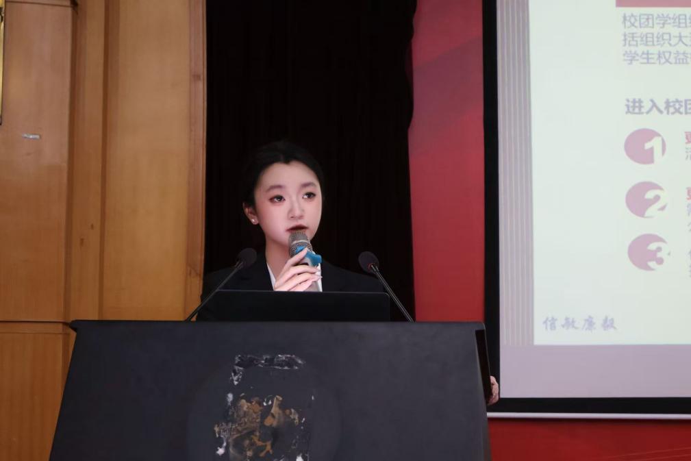 晏瑾祎从刘耀彬书记和邓辉校长“突破困局,开创新局”的理念出发,围绕江财文化,团学组织,科研竞赛,第二课堂四个方面为新生开启江财之旅筑牢基础。在宣讲会中,她帮助新生快速了解江财“信敏廉毅”的校训内涵,感受文化底蕴;鼓励新生积极参加团学组织锻炼个人能力;引导新生提前树立竞赛意识,积累竞争力;推动新生参与第二课堂活动,丰富校园体验。