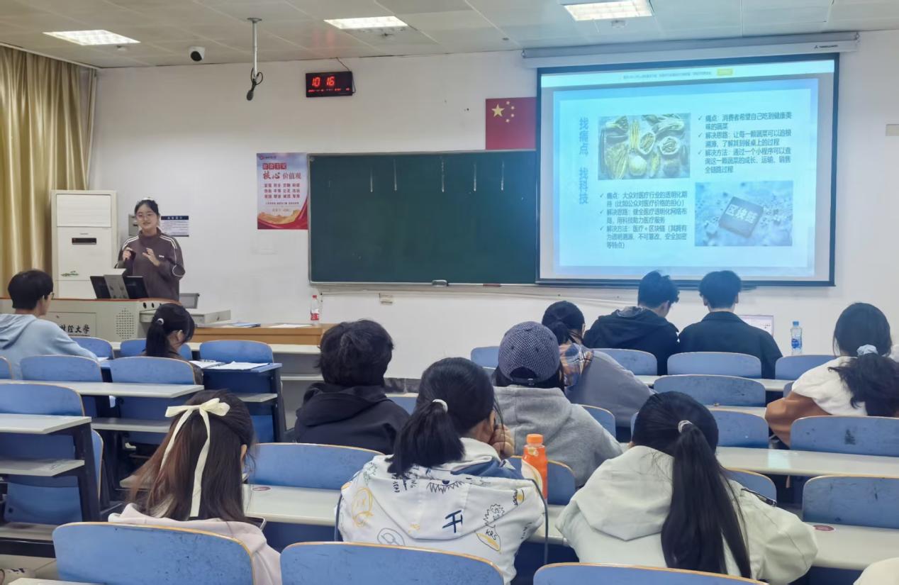在分享环节,舒静雅同学从团队组建、选题思路和策划书撰写三个方面对项目全流程展开系统介绍,重点讲解策划书写作框架,强调应充分利用资源挖掘市场痛点、优化项目逻辑结构、以解决社会问题为中心目标。