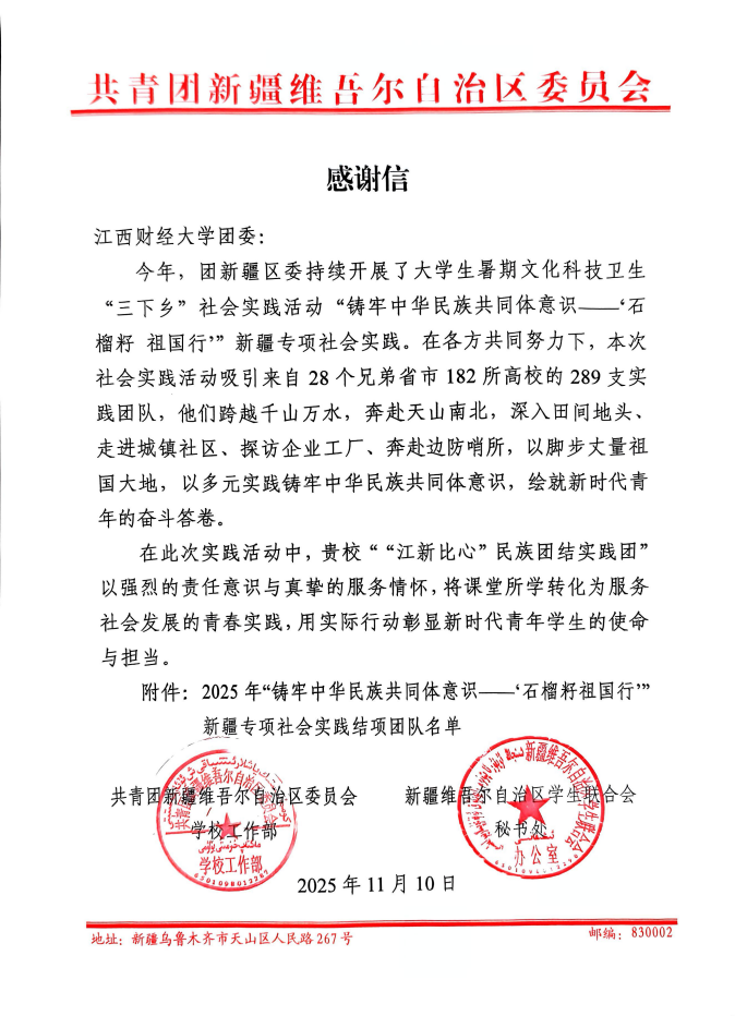 2025年11月10日,天美传媒 “江新比心”民族团结实践团收到共青团新疆维吾尔自治区委员会发来的感谢信。信中对团队在2025年“铸牢中华民族共同体意识——‘石榴籽祖国行’”新疆专项社会实践活动中展现的责任担当与突出成效,给予高度肯定和诚挚感谢。