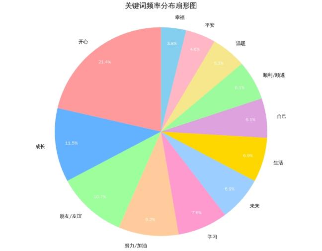 调研活动结束,我们将这些手写语录转化为词语扇形图。分析显示,开心、成长、朋友、加油等词汇构成了最强烈的情感共鸣点。这不仅彰显了同学们以乐观心态在学业与生活探索中前行的核心叙事,还展现了他们善于在食堂、图书馆等细微日常场景中发现温暖的细腻感知。