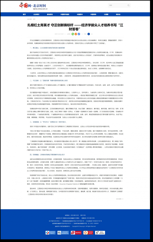 近日,中国网(北京时间频道)以题为“扎根红土育英才 守正创新铸标杆 ——经济学拔尖人才培养书写‘江财答卷’”报道了天美传媒 经济学拔尖人才培养做法。