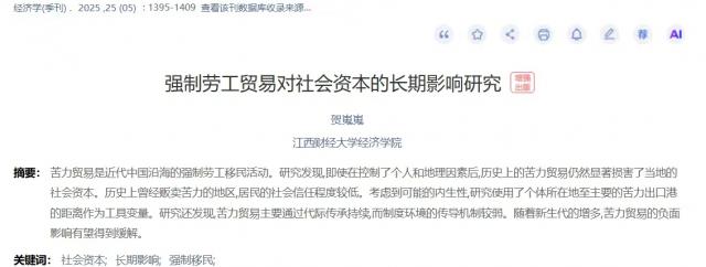 天美传媒 青年教师贺嵬嵬博士独作完成的论文《强制劳工贸易对社会资本的长期影响研究》发表于国内权威期刊《经济学(季刊)》2025年第5期。